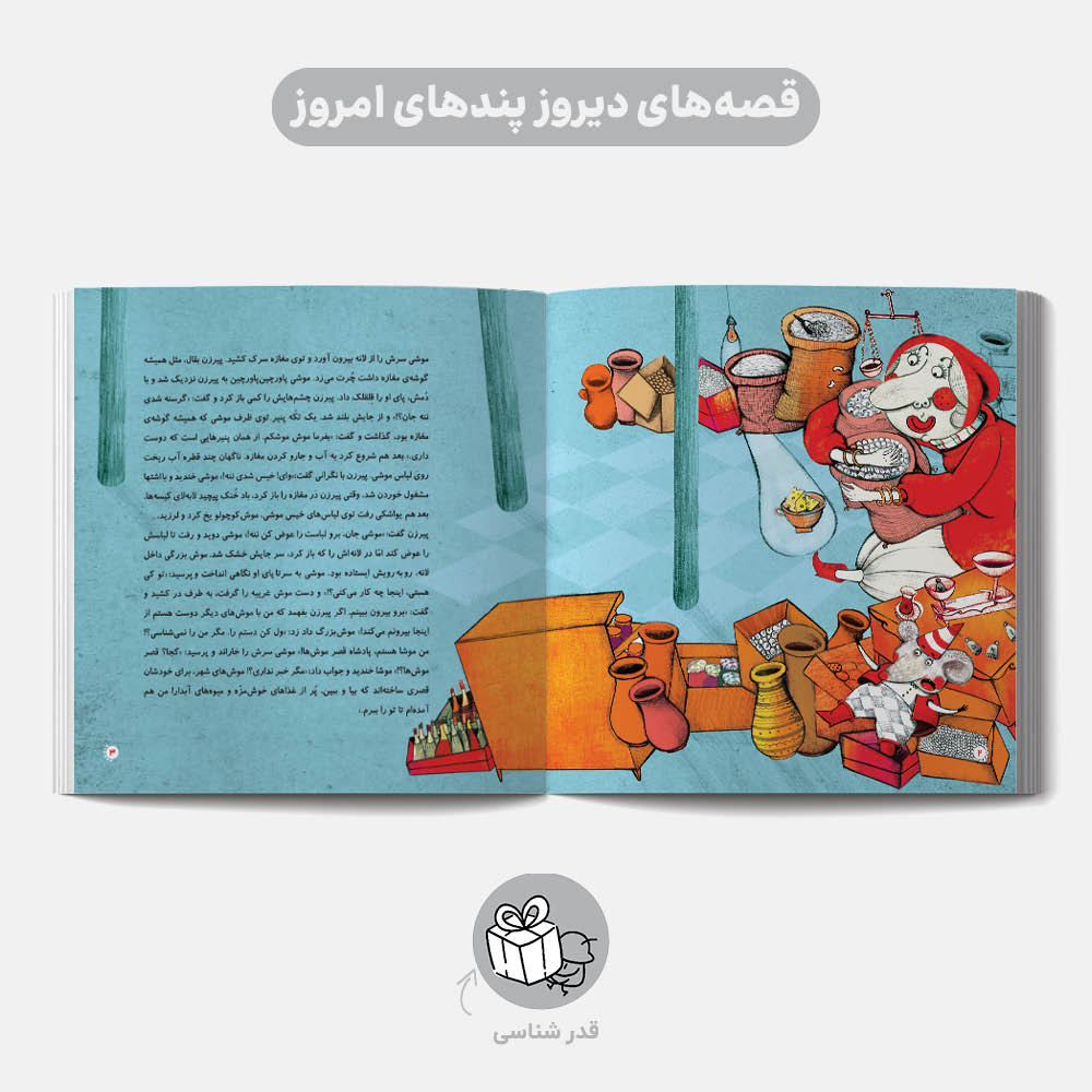 یک گاز از کتاب موش و بقال: پیرزن بقال با موش‌کوچولویی که توی دیوار مغازه‌اش زندگی می‌کند، خیلی مهربان است. تا اینکه یک روز سر و کله‌ی موش بزرگی توی لانه‌ی موشی پیدا می‌شود و…